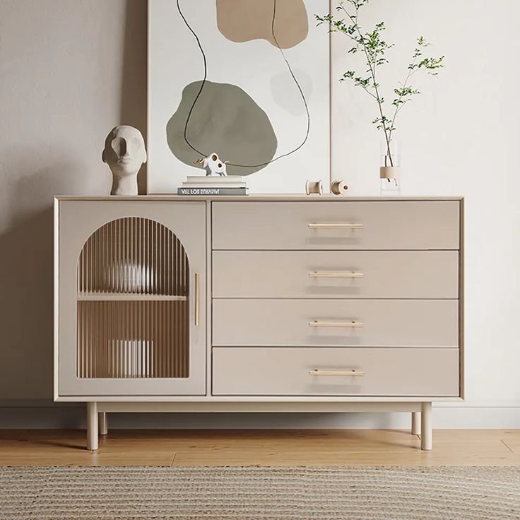 Beige Storage Cabinet with Drawers & Glass Door Storage Cabinet